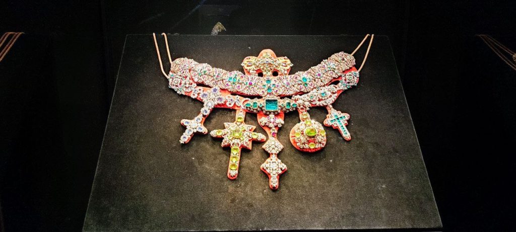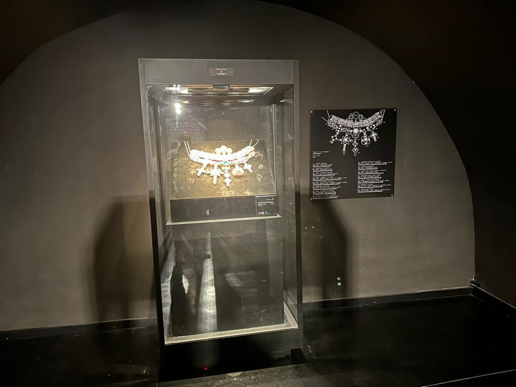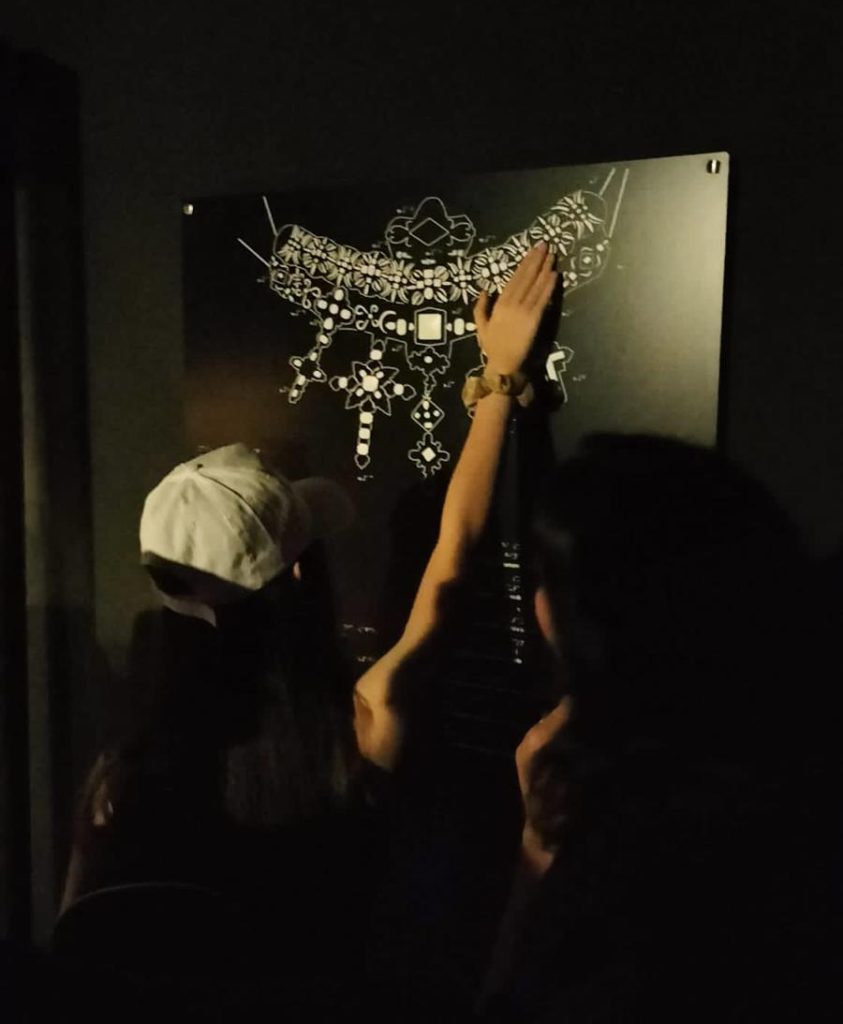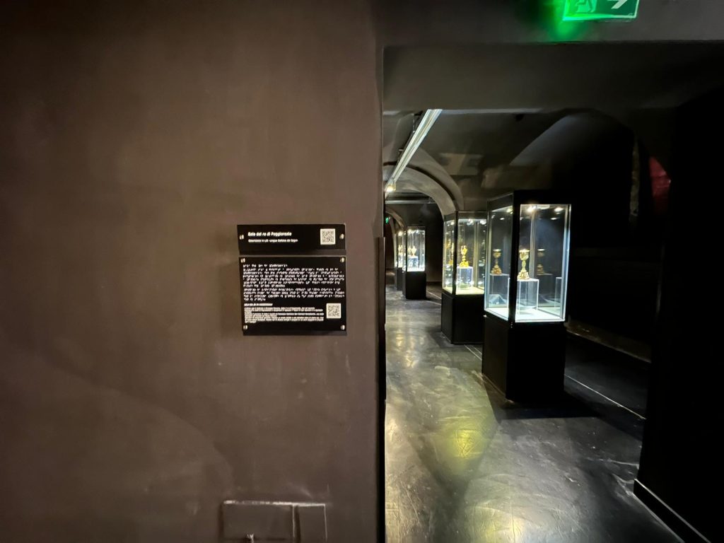 I doni del Tesoro sono custoditi in teche blindate, per ragioni di sicurezza e conservazione. Ma è proprio all’esterno di queste barriere trasparenti che prende vita una nuova esperienza: pannelli tattili posizionati in punti strategici permettono al pubblico non vedente – ma anche a chiunque voglia vivere l’opera attraverso un senso diverso – di percepire le forme e i dettagli degli oggetti.